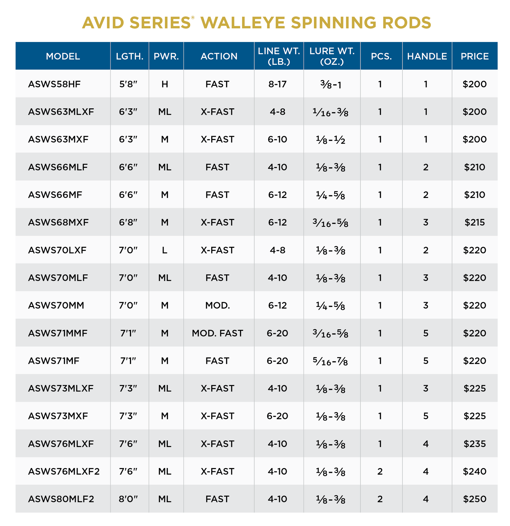 Avid Walleye Rods are designed and handcrafted in Park Falls, WI USA. Rods are brimming with proprietary St. Croix Rod proprietary technologies: IPC, ART, TET, FRS.