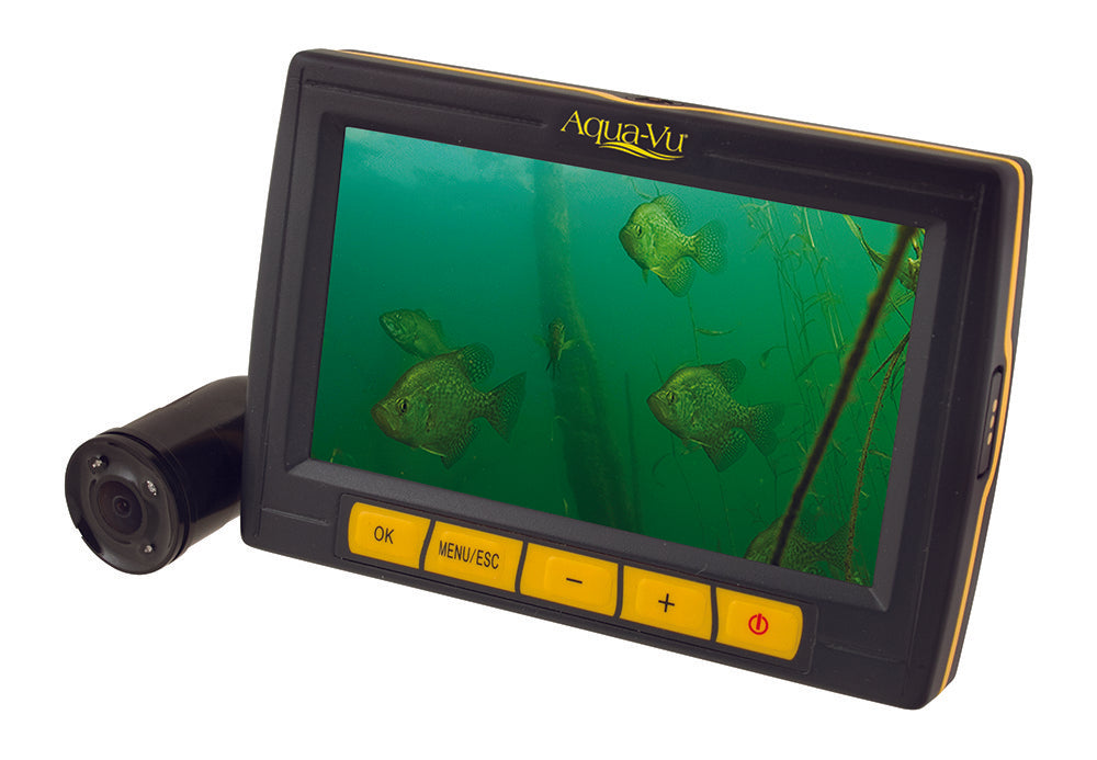 The Aqua-Vu micro Stealth 4.3 Underwater Viewing System delivers crystal clear color video in a smartphone-sized unit. Its underwater viewing unit has a high-resolution 4.3-inch LCD with 50 feet of tough, durable camera cable and a thumb-sized micro underwater cameraโall wrapped on an integrated spool. Camera includes auto infrared lighting and moves quietly through the underwater world with the aid of an included trolling fin and clip-on ballast weight.