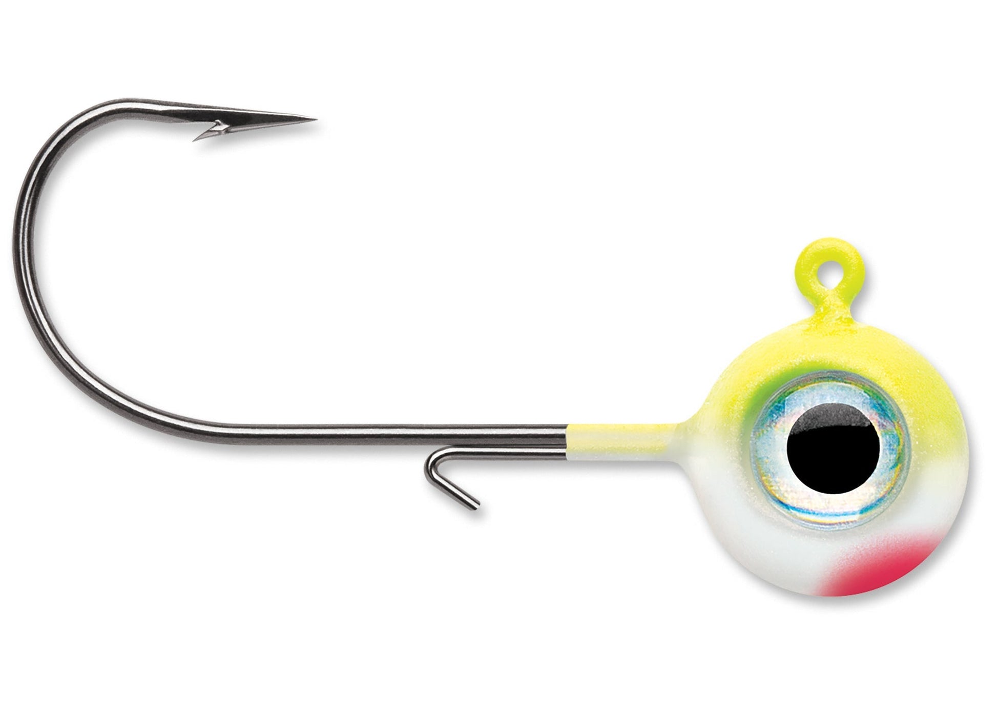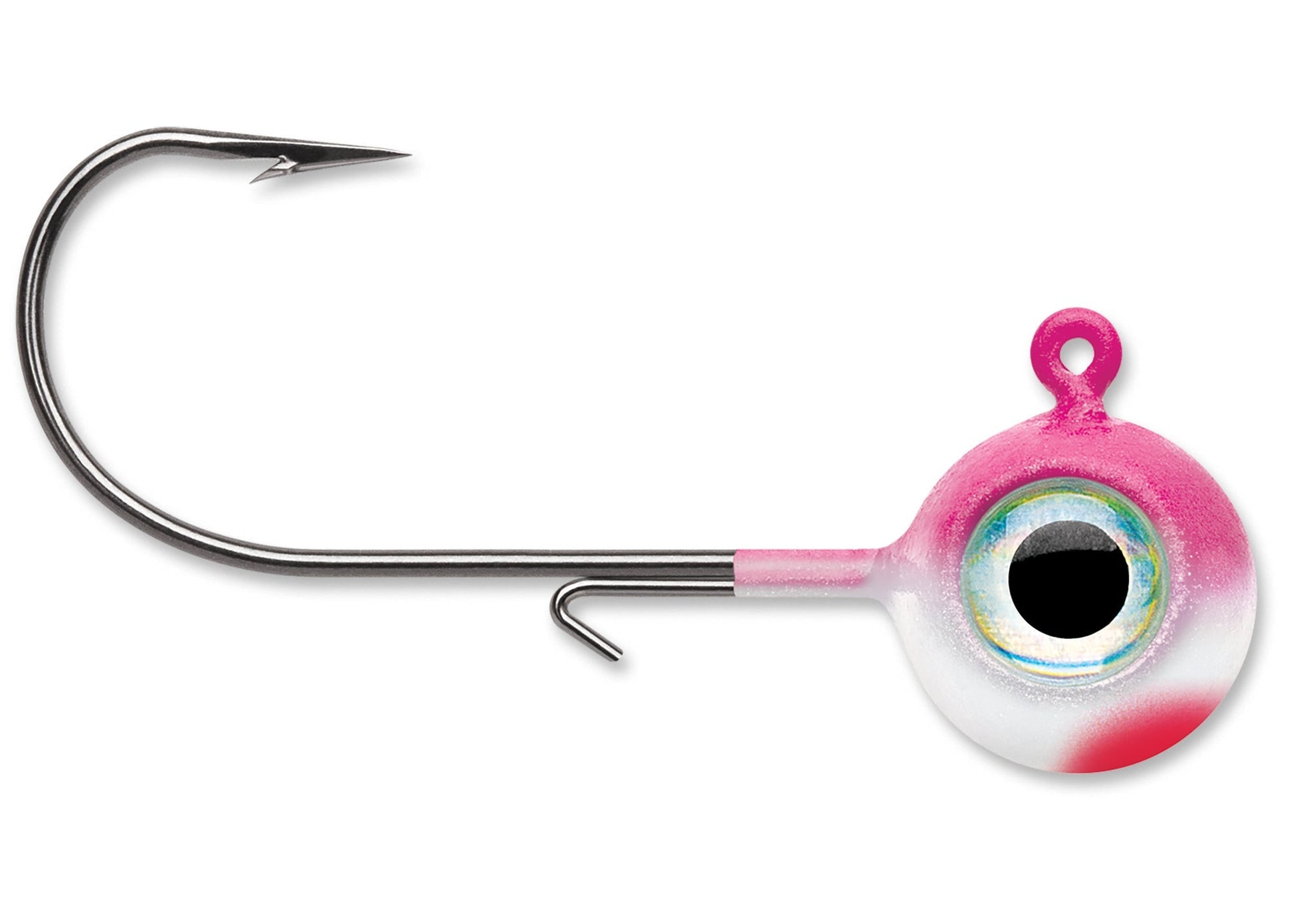 This VMC® upgraded version of the traditional Aspirin-shaped heads provides added control. 3-D holographic eyes create the illusion of a wider profile while adding realism. Assembled with a VMC® Premium high-carbon steel hook with top of the line black nickel finish. The wide range of colors includes UV Bright finish colors that guarantee you to catch more fish in all water conditions.